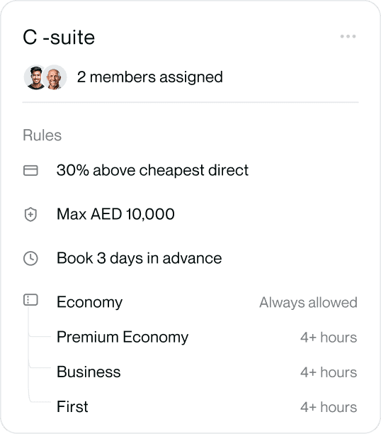 Our dynamic policy engine ensures every booking stays within budget—without the manual oversight.