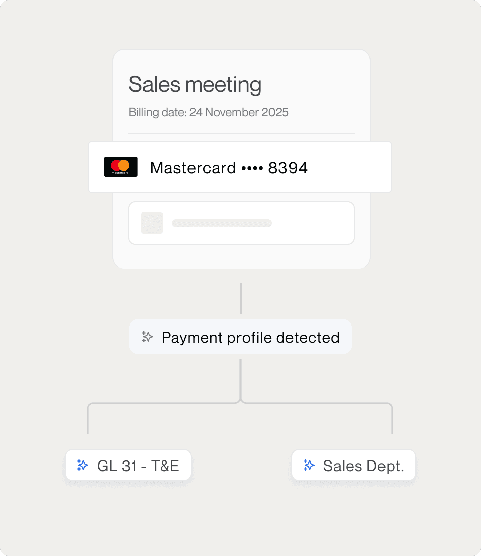 Payment profiles let you link corporate cards to specific departments, teams, or cost centers so every booking charges to the right place automatically. For example: link the "Sales Department Amex" to your Sales cost center, and any employee in Sales who books travel will automatically charge that card with the Sales cost center pre-assigned. No manual reassignment later, no end-of-month cleanup—charges go to the right place from day one.