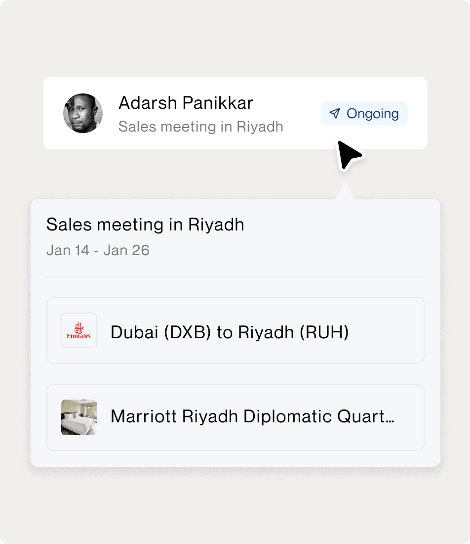 See upcoming, active, and completed trips across the company — who’s traveling, where they are, and what’s coming next.