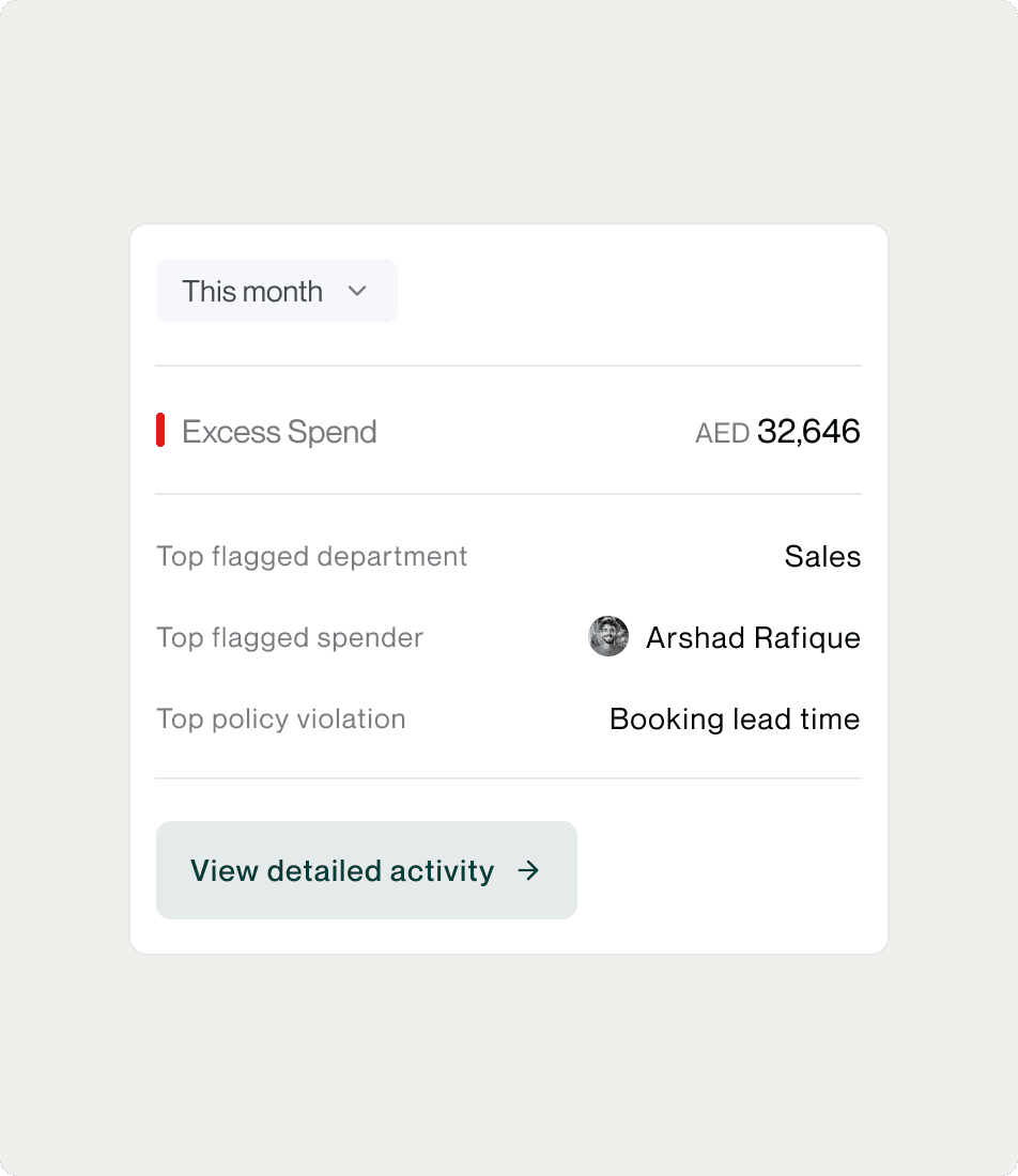 Extremely granular. You can drill down from company-wide totals to individual transactions: Example drill-down path: Total company spend: AED 450,000/quarter Sales department: AED 180,000 (40% of total) MENA sales team: AED 95,000 (53% of sales) Employee "Sarah Khan": AED 22,000 (23% of MENA team) Route "Dubai-Riyadh": AED 8,400 (38% of Sarah's travel) Individual booking: AED 1,850 on March 15 (business class upgrade approved by manager) Every level shows context: who approved it, why it was out-of-policy, whether it followed procedures, and full receipts. Complete transparency from 30,000-foot view down to transaction-level detail.