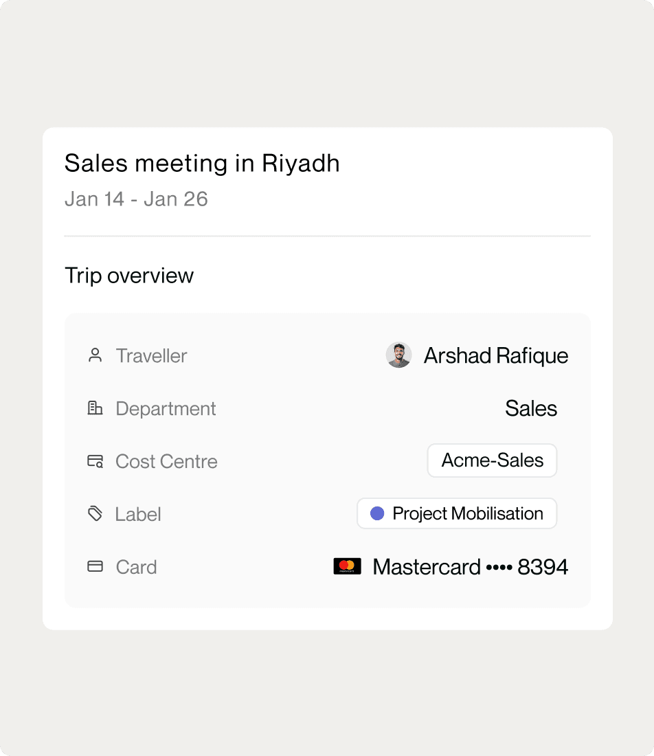 Each trip is tied to the right traveller, card, and cost centre at booking, so reconciliation happens as spend occurs.