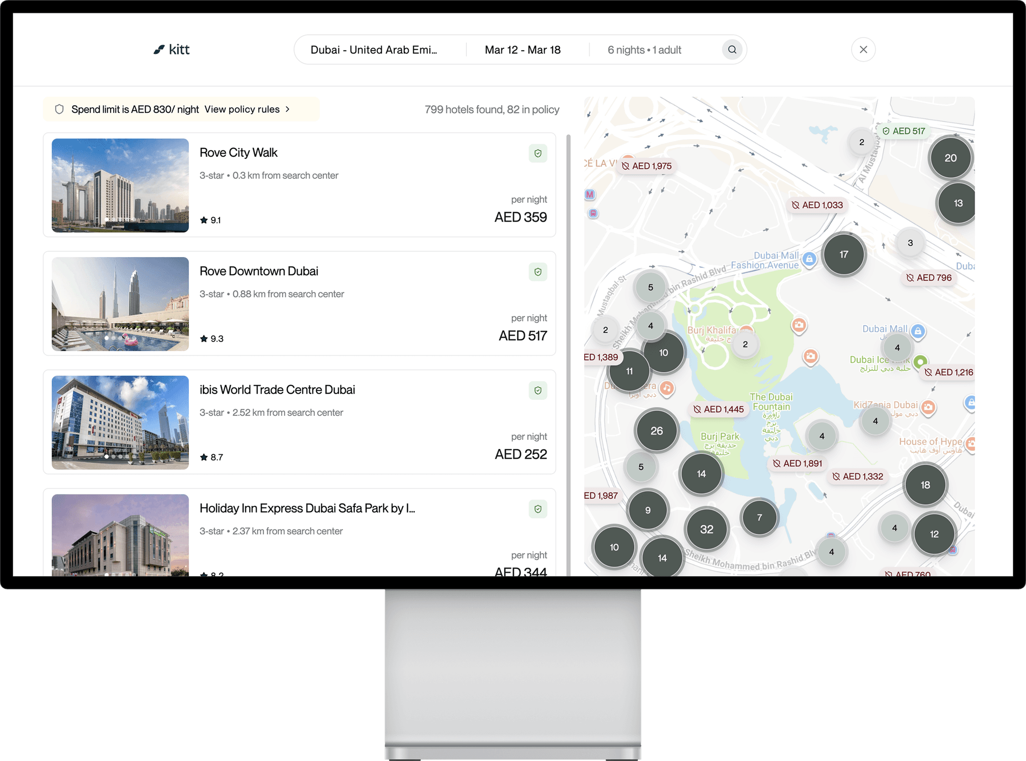 You see policy guidelines in real-time while searching—Kitt highlights what's in-policy and flags what requires approval before you even click "book." Instead of reading a 10-page PDF, you just search for your trip and the platform shows you: "Hotels up to AED 750/night in Dubai are approved automatically" or "Business class allowed on flights over 6 hours." If something's not clear, there's a help button that explains your company's specific rules without leaving the booking page.